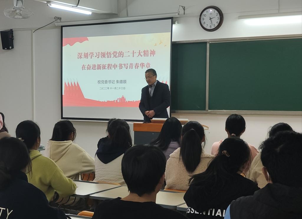 2022年11月23日下午在太阳成集团122ccvip第二教学楼322教室,公司党委书记朱德顺为大一新生上了一堂精彩、激昂的“形势与政策”课,以“在奋进新征程中书写青春华章”为题,宣讲党的二十大精神。太阳成集团122ccvip经理助理陈志操主持,2022级经济学普本新生代表参加。